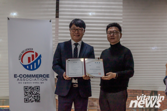 | ▲ 지난 1월16일, 한국인플루언서이커머스협회는 씨앤씨글로벌홀딩스 김대성 대표를 제2대 회장으로 위촉했다. 협회 이태경 고문(우)이 김대성대표(좌)에게 위촉장을 전달하고 있다. |