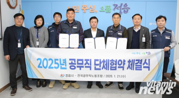 정읍시와 전국공무직노동조합이 8개월간의 긴 협상 끝에 노사 상생을 위한 합의점을 찾았다. 시는 21일 시청 시장실에서 2025년 공무직 단체협약을 체결하고, 근로 조건 개선과 복지 향상을 통해 대시민 행정 서비스의 질을 높이기로 뜻을 모았다고 밝혔다.