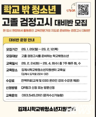 | 김제시학교밖청소년지원센터, 2026년 검정고시 대비반 모집 |