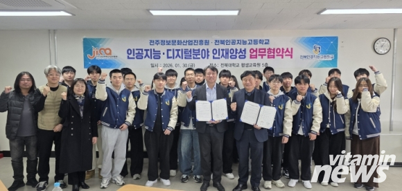 (재)전주정보문화산업진흥원(이하 진흥원)은 30일 전북대학교 평생교육원에서 전북인공지능고등학교(이하 전북인공지능고)와 인공지능·디지털 분야 인재 양성 및 지역 산업·교육 발전을 위한 업무협약을 체결했다.