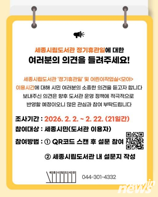 | 세종시립도서관 정기휴관일, 시민 의견을 듣습니다 |