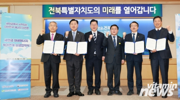 전북특별자치도가 9일 도청에서 새만금개발청, 한국전력공사, 한국수력원자력㈜와 함께 `새만금 수상태양광(1단계) 발전사업`의 적기 구축을 위한 상호 협력 업무협약(MOU)을 체결했다.