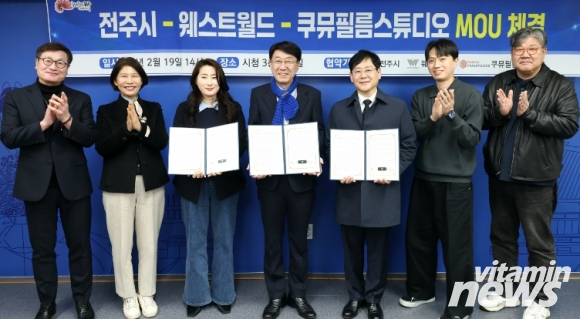 시와 웨스트월드(대표 손승현), 쿠뮤필름스튜디오는 19일 시청 3층 소회의실에서 우범기 전주시장과 손승현 웨스트월드 대표, 양수연 쿠뮤필름스튜디오 본부장 등이 참석한 가운데 ‘전주시 영화영상산업 발전 및 투자를 위한 양해각서(MOU)’를 체결했다.