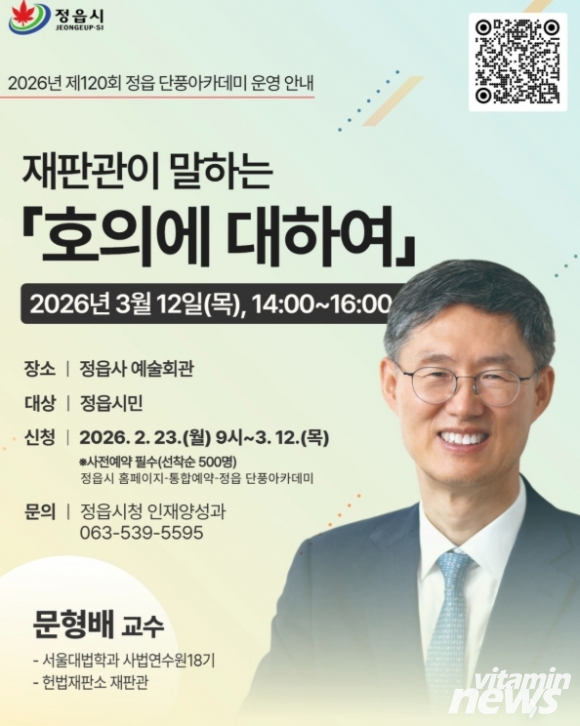 정읍시가 오는 12일 오후 2시 정읍사예술회관에서 문형배 전 헌법재판관을 초청해 시민들의 성숙한 공동체 의식을 함양하는 ‘제120회 정읍 단풍아카데미’를 개최한다.