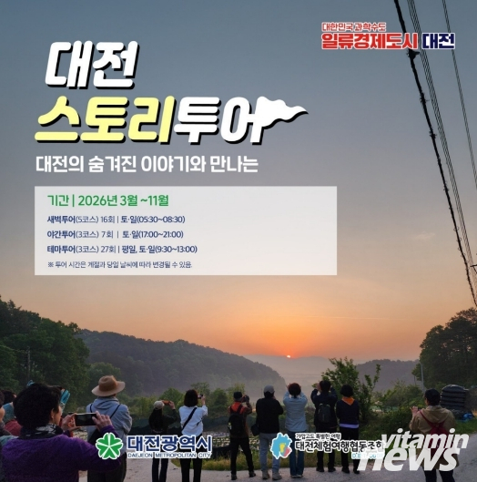 박승원 대전시 문화예술관광국장은 “2026 대전스토리투어는 자연?역사?문화에 이야기를 입혀 시민과 관광객이 도시를 새롭게 만날 수 있도록 기획한 대전형 관광 프로그램”이라며, “새벽의 감성, 밤의 매력, 마을과 인물의 스토리를 더욱 촘촘하게 담아 오래 기억에 남는 여행 경험을 선사하겠다”라고 밝혔다.