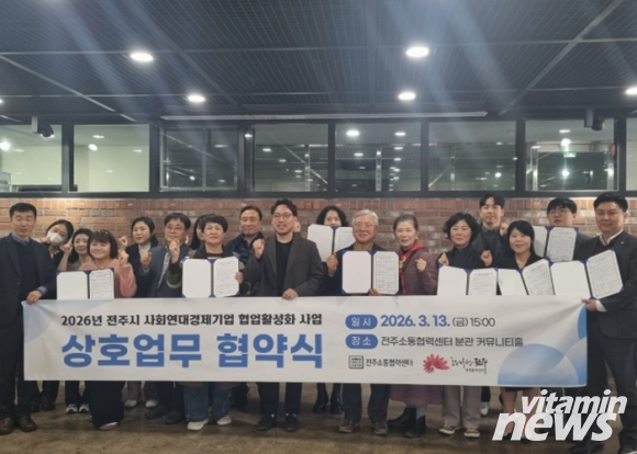 전주시 지역소통협력센터는 13일 센터 분관 커뮤니티홀에서 올해 사업에 선정된 9개 기업과 ‘전주시 사회연대경제기업 협업활성화 사업’ 업무 협약식을 개최했다.