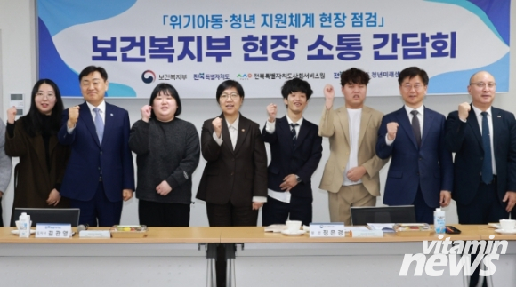 | 16일 전북특별자치도 청년미래센터에서 열린 위기아동,쳥년 지원체계 보건복지부 현장 소통 간담회에 정은경 보건복지부 장관, 김관영 도지사 등 참석자들이 소통 간담회를 갖고 기념촬영을 하고 있다 |