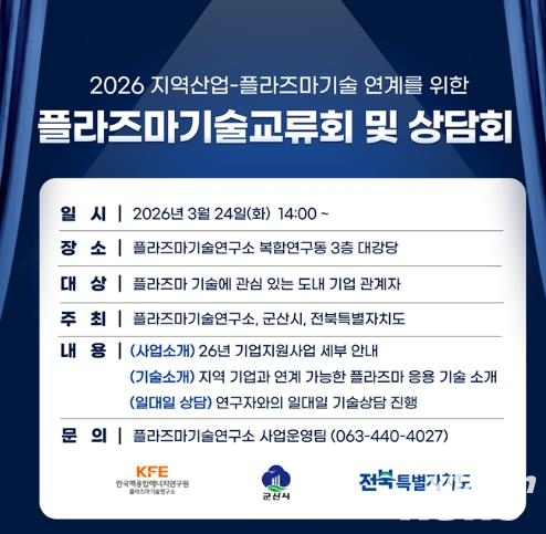 주요 프로그램으로는 산업 현장에 적용 가능한 플라즈마 기술 소개를 비롯해 기업지원사업 안내, 전문 연구원과의 1:1 맞춤형 컨설팅이 진행될 예정이다.