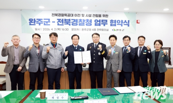 완주군과 전북경찰청은 2일 완주군청 전략회의실에서 경찰특공대 이전 및 청사 신축을 위한 업무협약(MOU)을 체결하고 전북 경찰특공대 이전 사업을 본격적으로 추진하기로 했다.