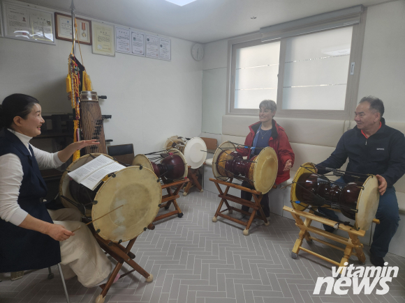 | 국악사랑에서 김철수씨와 아내 끌레르씨가 체험을 하고 있다. |