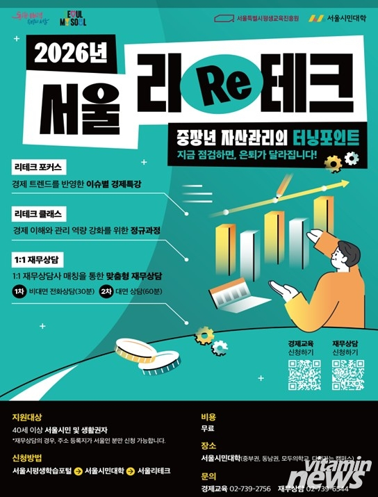 서울시가 고물가·고금리 등 경제환경 변화 속에서 중장년층의 안정적인 자산관리와 은퇴 설계를 지원하기 위해 ’26년 서울 리(Re)테크’를 본격 추진한다. 서울 리(Re)테크는 40세 이상 서울 시민을 대상으로 맞춤형 경제교육과 재무 상담을 무료로 제공하는 사업이다