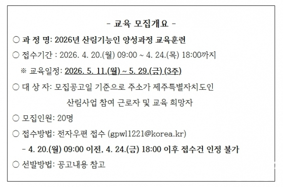 이번 교육은 5월 11일부터 29일까지 3주간 산림조합중앙회 제주지역본부에서 진행되며, 공고일 기준 제주도에 주소지를 둔 도민이면 누구나 신청할 수 있다.