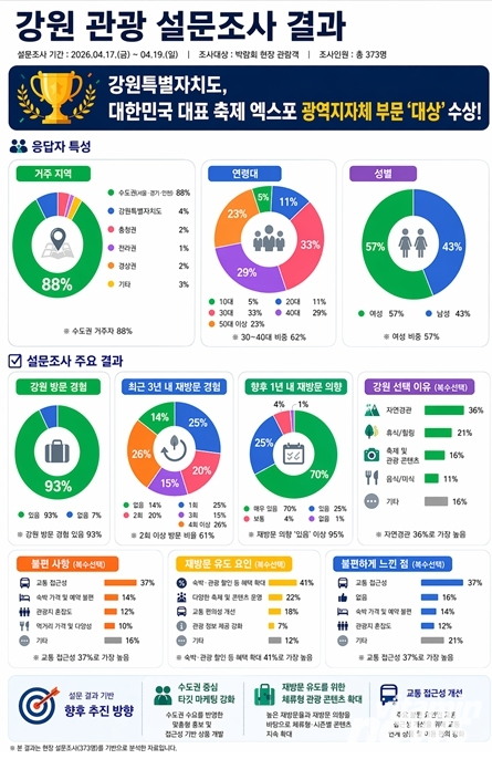 강원특별자치도와 강원관광재단은 2026년 4월 17일부터 19일까지 수원컨벤션센터에서 열린 `대한민국 대표 관광전·축제 박람회`에 참가하여 홍보관을 운영한 결과, 강원특별자치도가 광역지자체 부문 ‘대상’을 수상했다고 밝혔다.